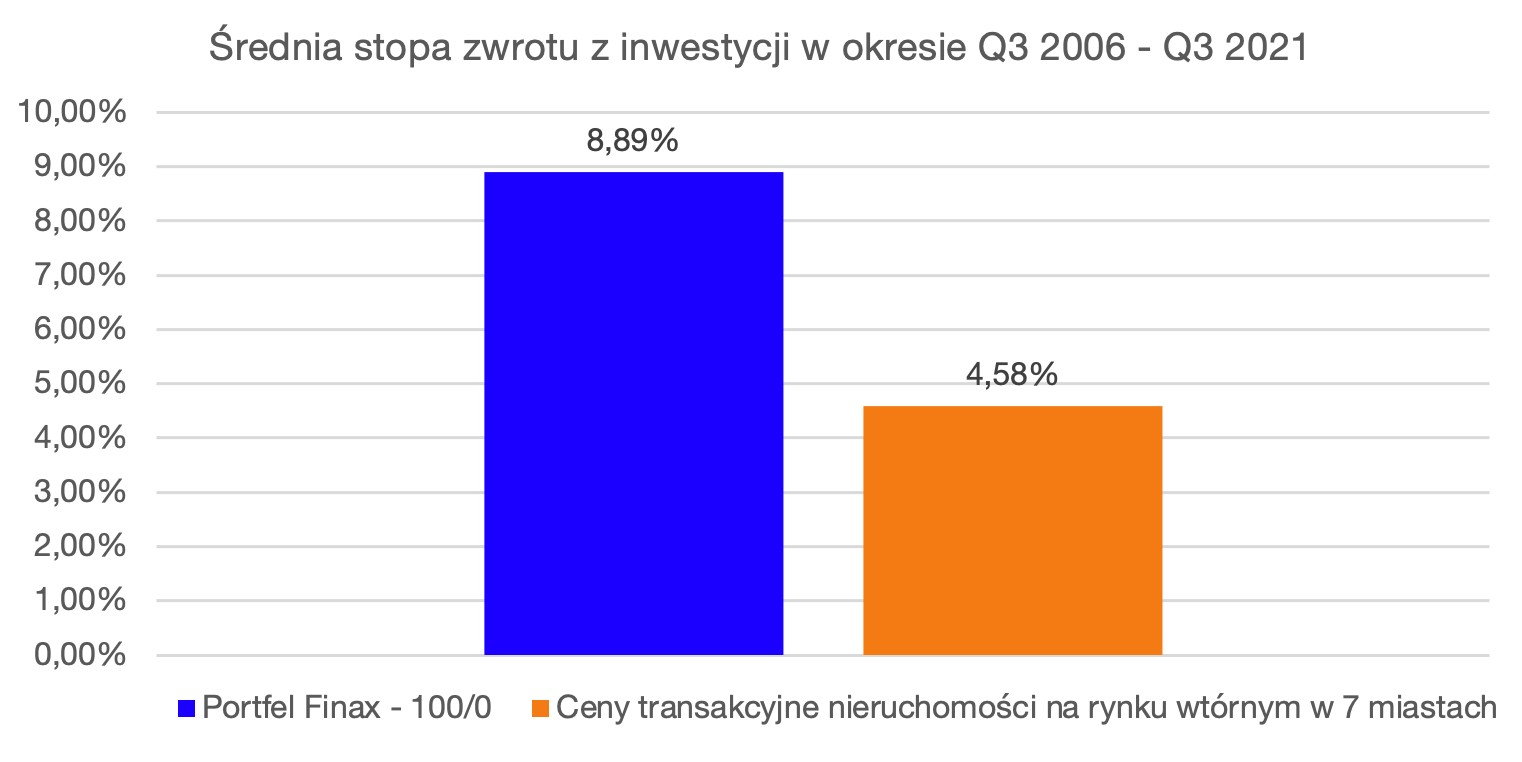 - Przyjmijmy długoterminowy roczny wzrost cen mieszkań na rynku pierwotnym na poziomie 4,5% i średnią stopę zwrotu dla Finax 100/0 na poziomie 9% rocznie.