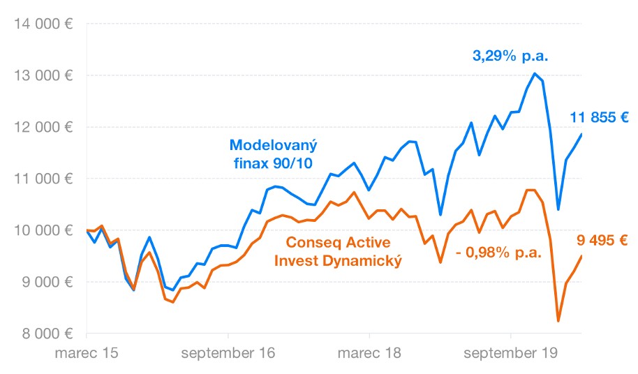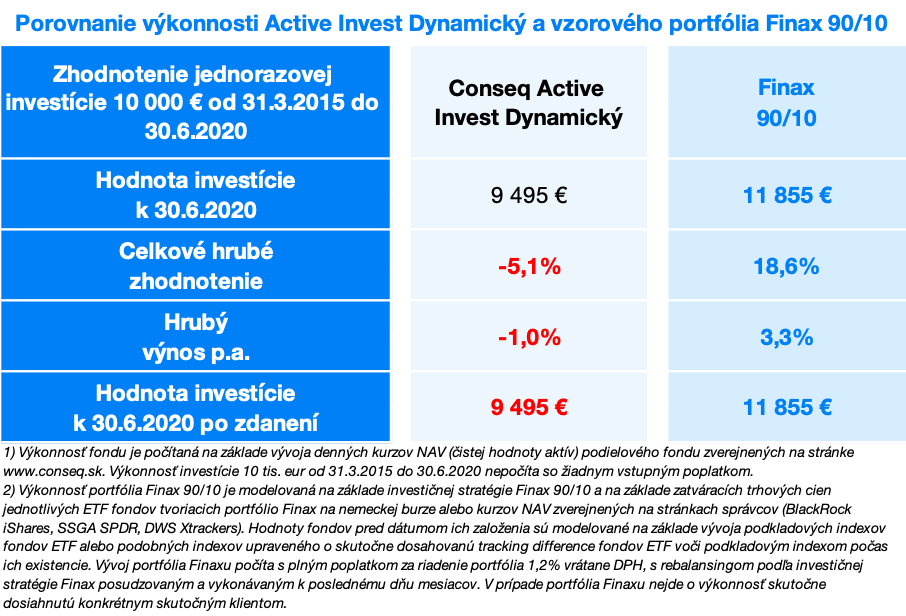 Podiel peňažných a dlhopisových fondov v majetku Active Invest Dynamický presahoval ku koncu júna 2020 10%, čiže nejde o fond s čisto dynamickými investíciami, a preto ho porovnáme s portfóliom Finax 90/10 od vzniku fondu, teda za 5 rokov aj pár mesiacov.