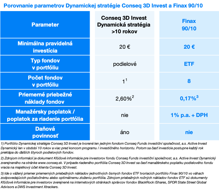 Nasledujúca tabuľka sumarizuje základné parametre portfólia Dynamická stratégia Conseq 3D Invest a porovnáva ich s portfóliom Finax 90/10, ktoré rizikom, teda podielom dynamických a konzervatívnych investícií zodpovedá zloženiu Active Investu.