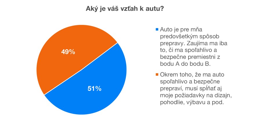 Na prieskum odpovedali prevažne muži. Je to téma, ktorá zaujíma práve ich. Aj u nás v rodine sú úlohy rozdelené tak, že starostlivosť o auto patrí do mojich povinností. Pre mňa však auto vždy bolo iba dopravný prostriedok. Od auta očakávam iba, aby ma spoľahlivo a bezpečne presunulo z bodu A do bodu B a mohol som ním odviesť požadovaný počet osôb a náklad.