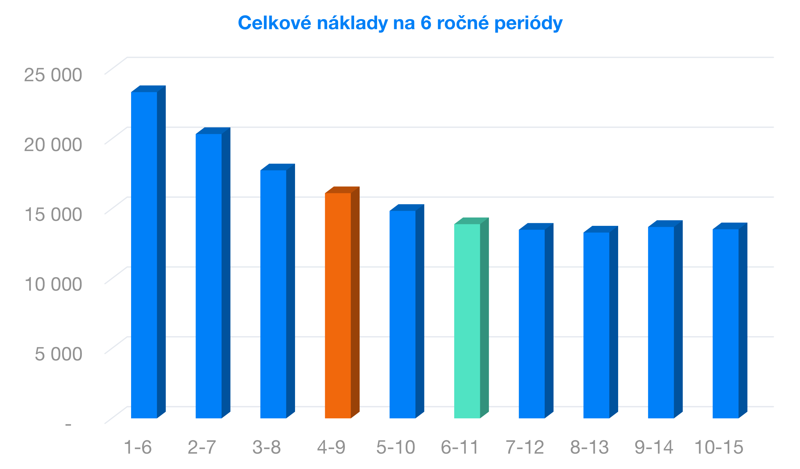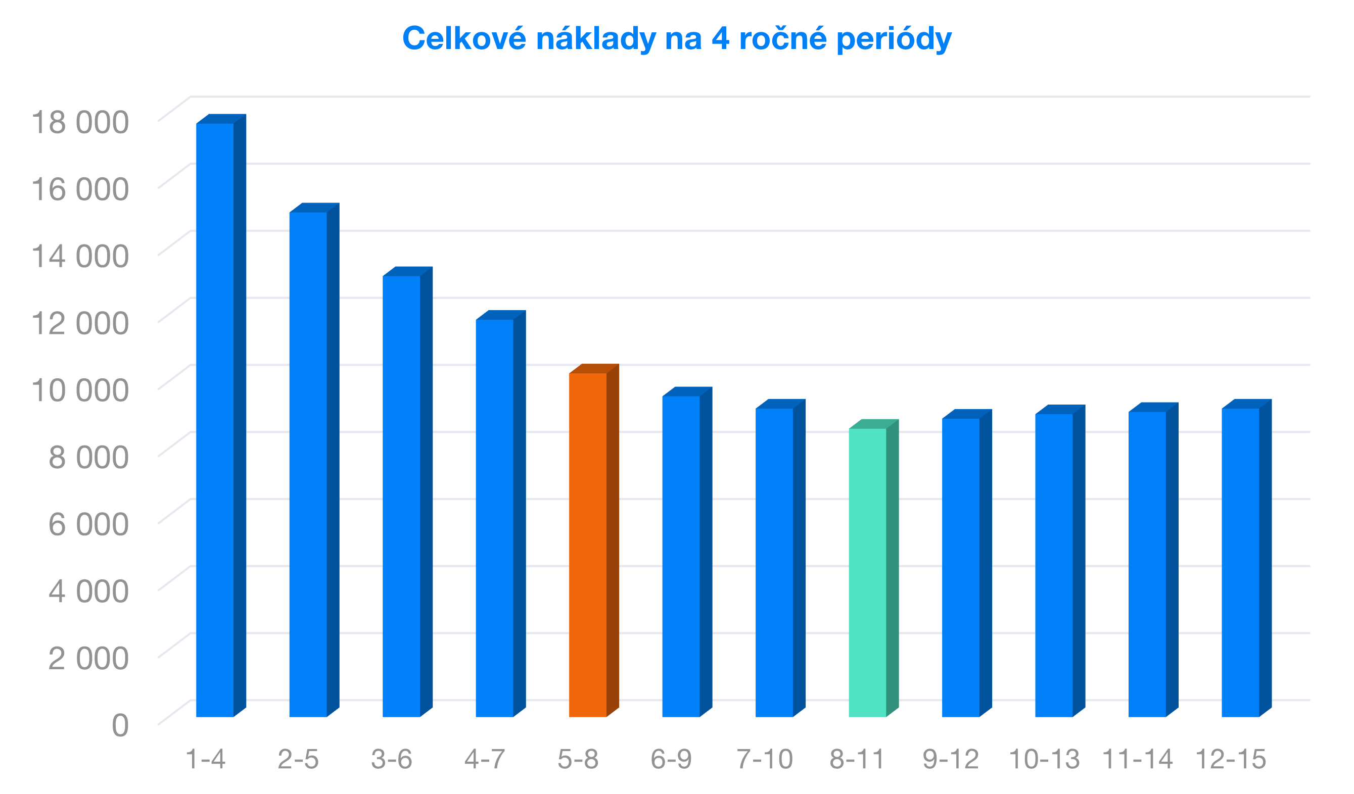 Pri štvorročných periódach som sa pozrel na kumulatívne náklady napríklad za prvý až štvrtý rok, druhý až piaty rok a tak ďalej. Stále využívam pri tom príklad s cenou auta na úrovni 30 000 eur. Toto je výsledok: