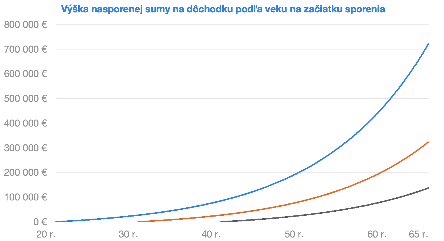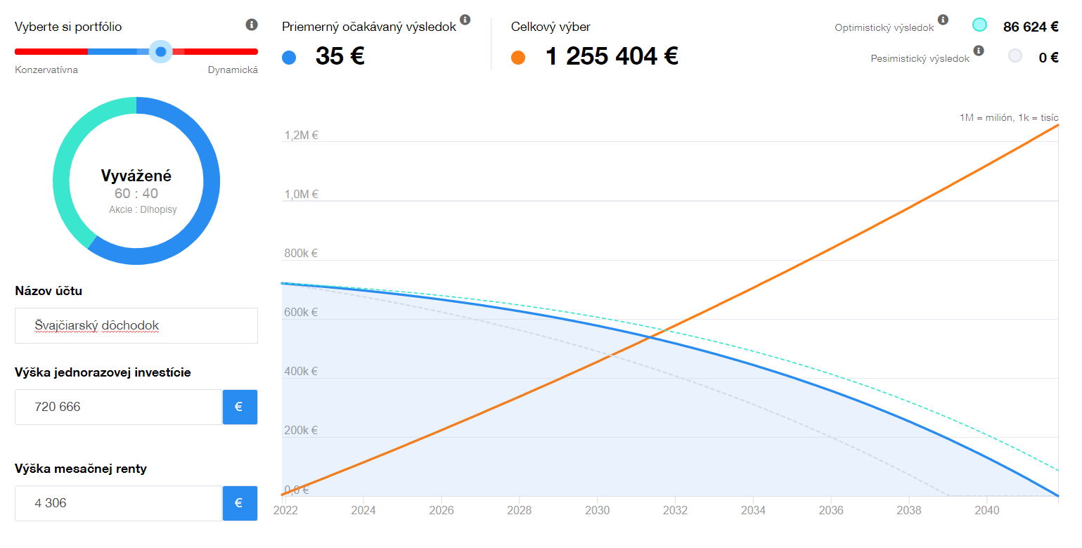 Ak to dáme do našej dôchodkovej kalkulačky, nasporených 720 tis. eur vám na dôchodku prinesie skutočne švajčiarsky mesačný dôchodok 4306 eur počas dvadsiatich rokov, ktorý ešte budeme automaticky každoročne zvyšovať o infláciu.