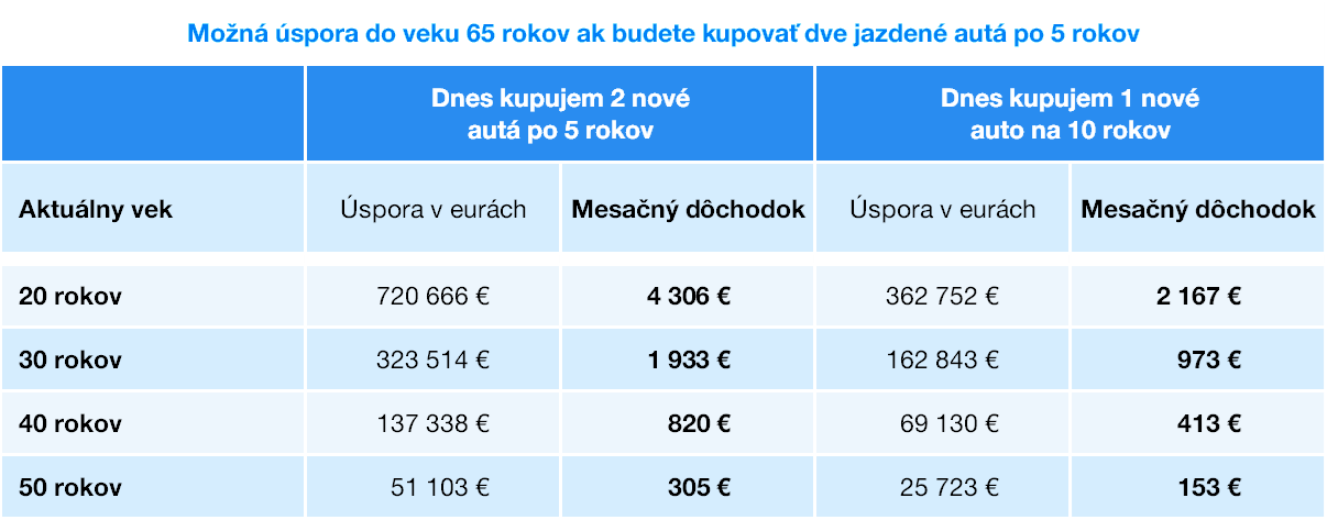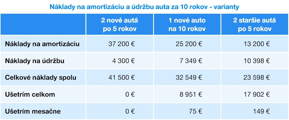 Mnohí ľudia nevedia nájsť vo svojom rodinnom rozpočte mesačne ani euro a tu zrazu môžu usporiť až 75 eur mesačne v prípade, ak by si kúpili nové auto raz za 10 rokov. Ak by ste však kupovali 5-ročné autá a používali ich päť rokov, v porovnaní s kúpou dvoch nových áut ušetríte až 149 eur mesačne (17 902 eur za 10 rokov).