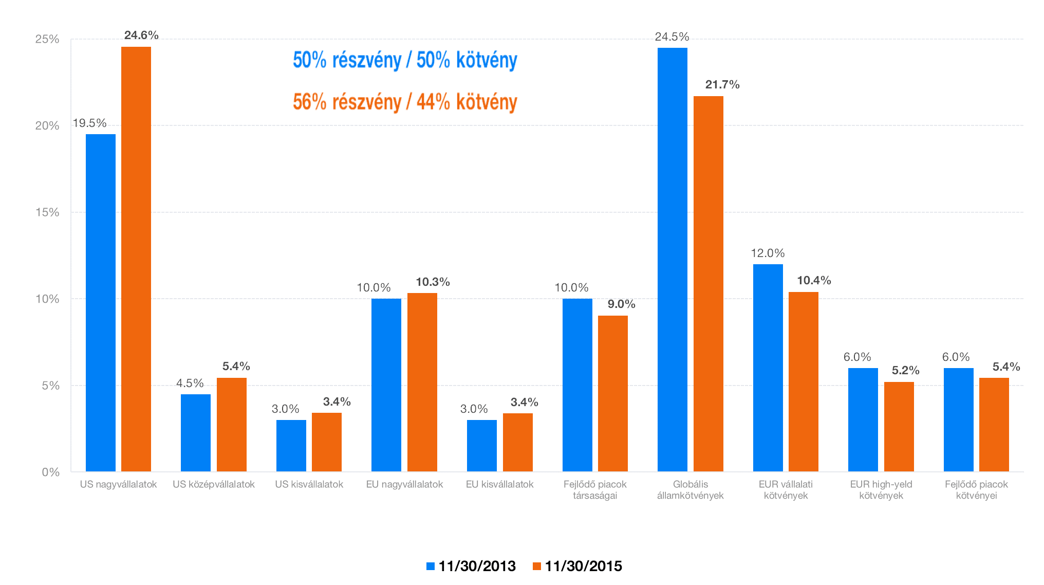 Az alapok eltérő fejlődésével változik azok portfólióban levő elosztása (részesedés). A következő grafikon összehasonlítja a Finax 50/50 stratégiájának összetételét 2013 novemberében (50% részvény és 50% kötvény), majd 2 évvel később 2015 novemberében (56% részvény és 44% kötvény).