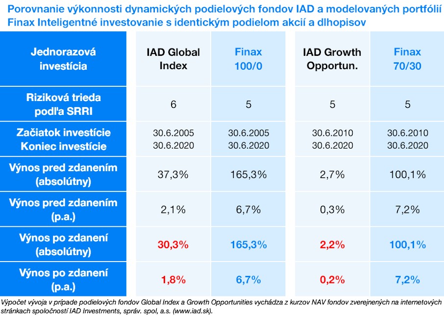 Fond IAD Global Index na 15-ročnom horizonte zvýšil hodnotu podielového listu o 30% po zdanení. Pri rovnakom horizonte naše modelované dynamické portfólio Finax 100/0 po zohľadnení poplatkov zarobilo investorom 165%.