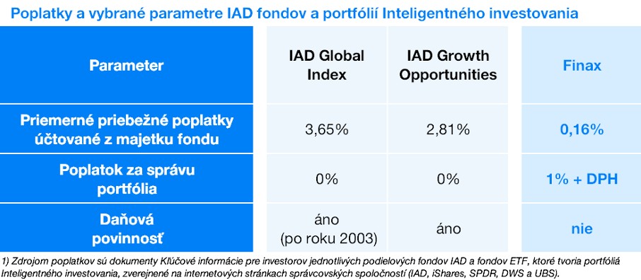 Nasledujúca tabuľka s parametrami troch investičných riešení nezahŕňa vstupné poplatky fondov IAD, ani poplatok za spracovanie platby a investičné poradenstvo Finaxu, ktoré sa môžu v investíciách objaviť v závislosti od konkrétneho distribučného kanála.