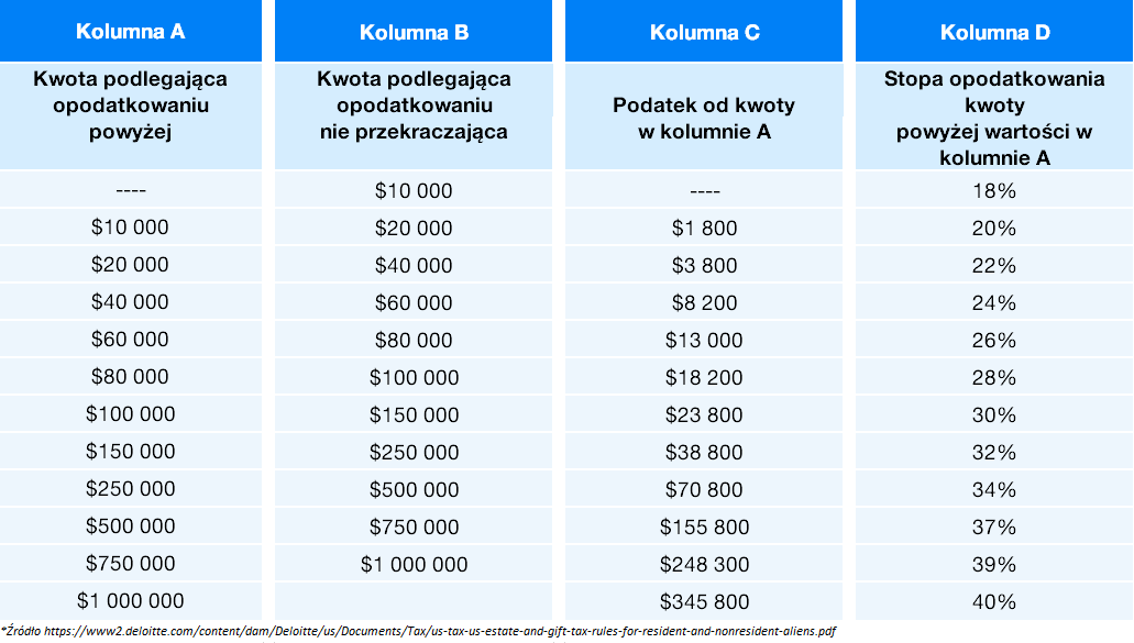 Podatek spadkowy dotyczy każdego, kto w chwili śmierci posiadał w Stanach Zjednoczonych jakiekolwiek aktywa – bez względu na to, czy chodzi o nieruchomości na Florydzie, czy też o akcje Apple. Dla obywateli USA wartość aktywów, powyżej której zobowiązani są płacić podatek spadkowy, wynosi kilka milionów dolarów. Dla cudzoziemców niebędących rezydentami ta kwota to jednak zaledwie 60 000 USD.