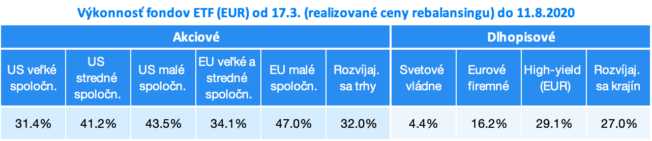 Ďalšia tabuľka odhaľuje eurové výnosy jednotlivých fondov ETF tvoriacich portfóliá Finax od vykonania rebalansingu 17.3. (realizované ceny) do 11.8.2020 (zatváracie ceny).