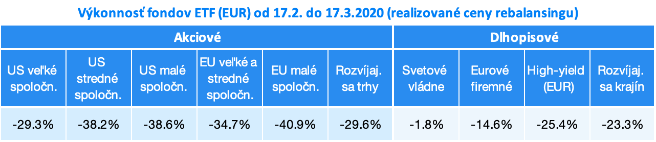 Tabuľka zobrazuje zmenu hodnoty jednotlivých 10 fondov ETF tvoriacich portfólio klienta v nasledujúcich štyroch týždňoch. Pohyby finančných trhov v dôsledku prepuknutia pandémie koronavírusu boli skutočne obrovské a dovtedy nepoznané. Ide o najprudší prepad trhov v ich modernej histórii.