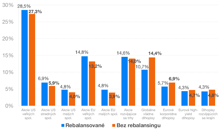 Z grafu je zreteľné, že do rebalansingu sa obe portfólia vyvíjali identicky. Zmenu v ich vývoji vyvolal až rebalansing, ktorý odlíšil skladbu portfólií. Kým podiel rizikových aktív v rebalansovanom portfóliu vzrástol, v nerebalansovanom zostal podvážený.