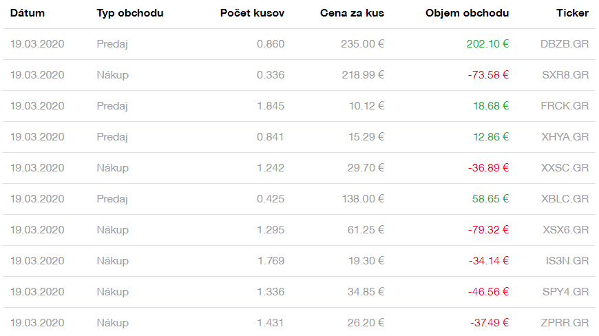 Upozorňujeme, že u každého klienta rebalansing vyzerá rozdielne. Uvedený príklad je jeden konkrétny účet na ilustráciu rebalansingu. Jednotlivé účty, na ktorých prebehol v marci rebalansing, mali v čase jeho realizácie rozdielne zloženie portfólií, podiel fondov bol rozličný, preto aj samotné obchody môžu byť iné, čo sa týka ich veľkosti, ale aj samotných cenných papierov.