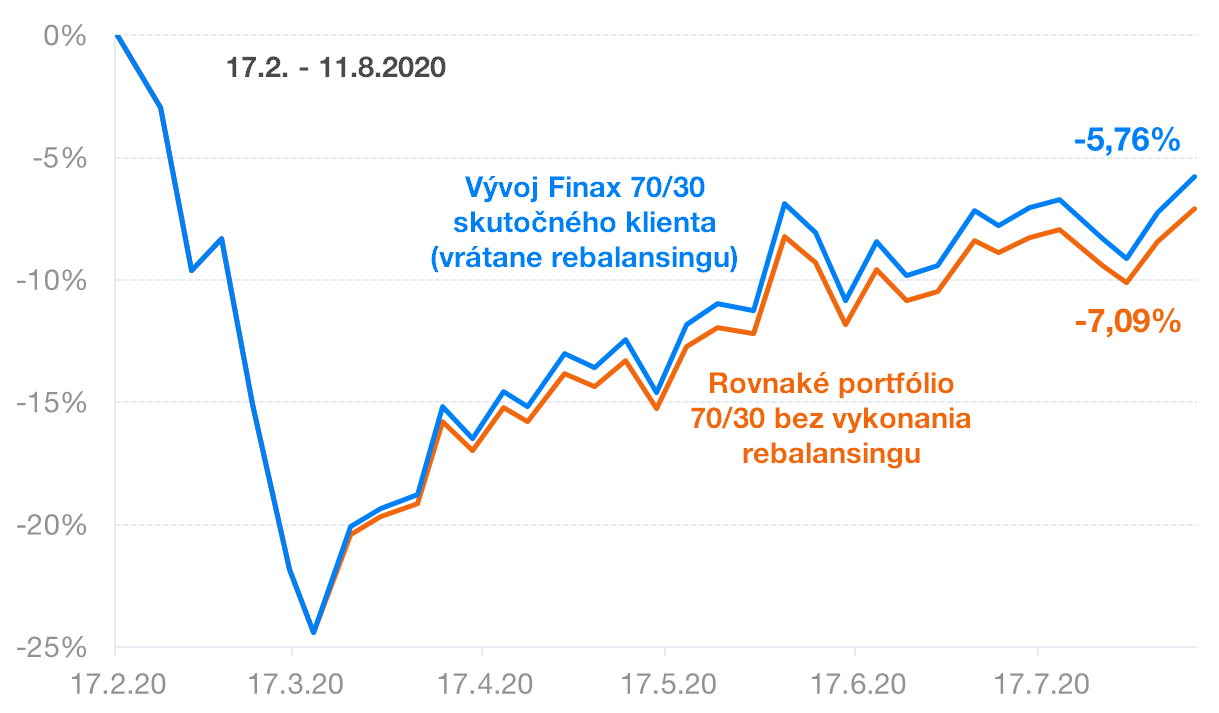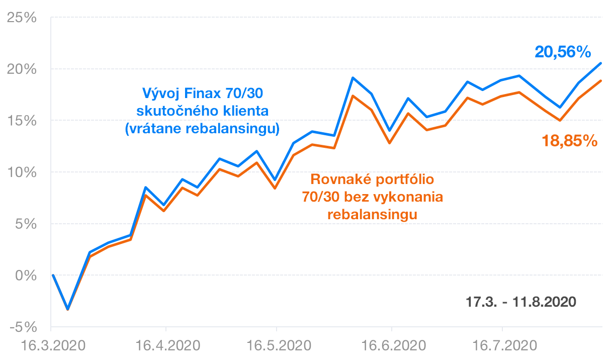 Vývoj týchto dvoch portfólií ukazuje nasledujúci graf. Modrá krivka reprezentuje skutočný vývoj portfólia klienta Finaxu a oranžová rovnaké portfólio bez vykonania rebalansingu 17.3.2020.