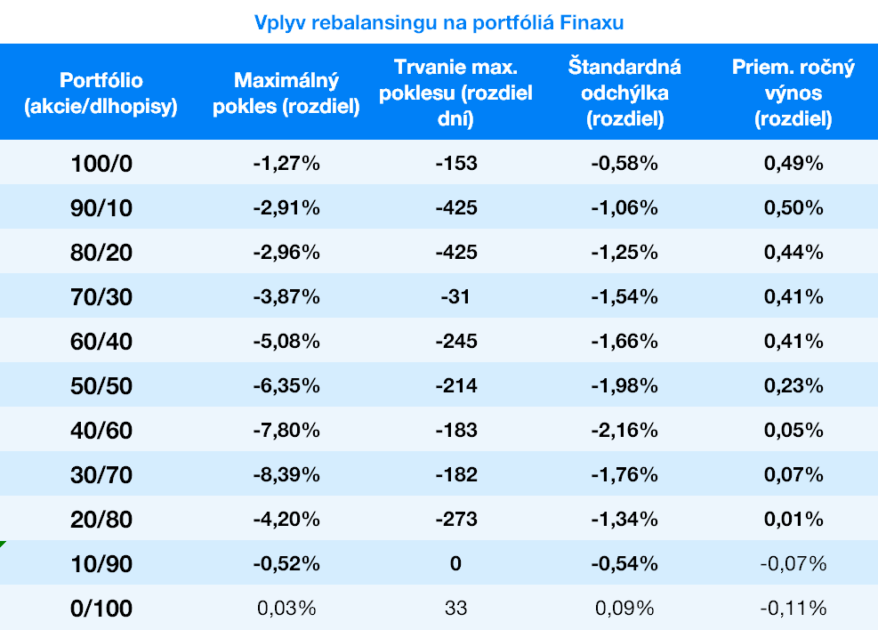 Pre lepšiu ukážku vplyvu rebalansingu na akciové portfóliá (s podielom akcií viac ako 60%) a dlhopisové portfóliá si pozrite nižšie uvedenú tabuľku.