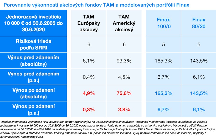 V porovnaní zohľadňujeme len náklady samotného riadenia investícií, teda abstrahujeme od poplatkov platených na vstupe a výstupe z investície, teda od poplatkov za spracovanie platby do 1000 eur a prípadného poplatku za investičné poradenstvo v prípade Finaxu a od vstupných a výstupných poplatkov v prípade podielových fondov.