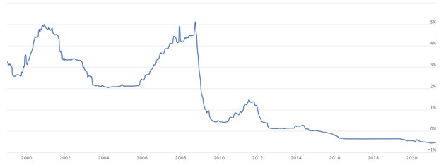 On se kroz svoju povijest većinom kretao između 2% i 5% ali je u zadnjih 10 godina krenuo padati te se prvi put u povijesti dogodilo da su kamate pale ispod 0%, odnosno otišle su u negativu.