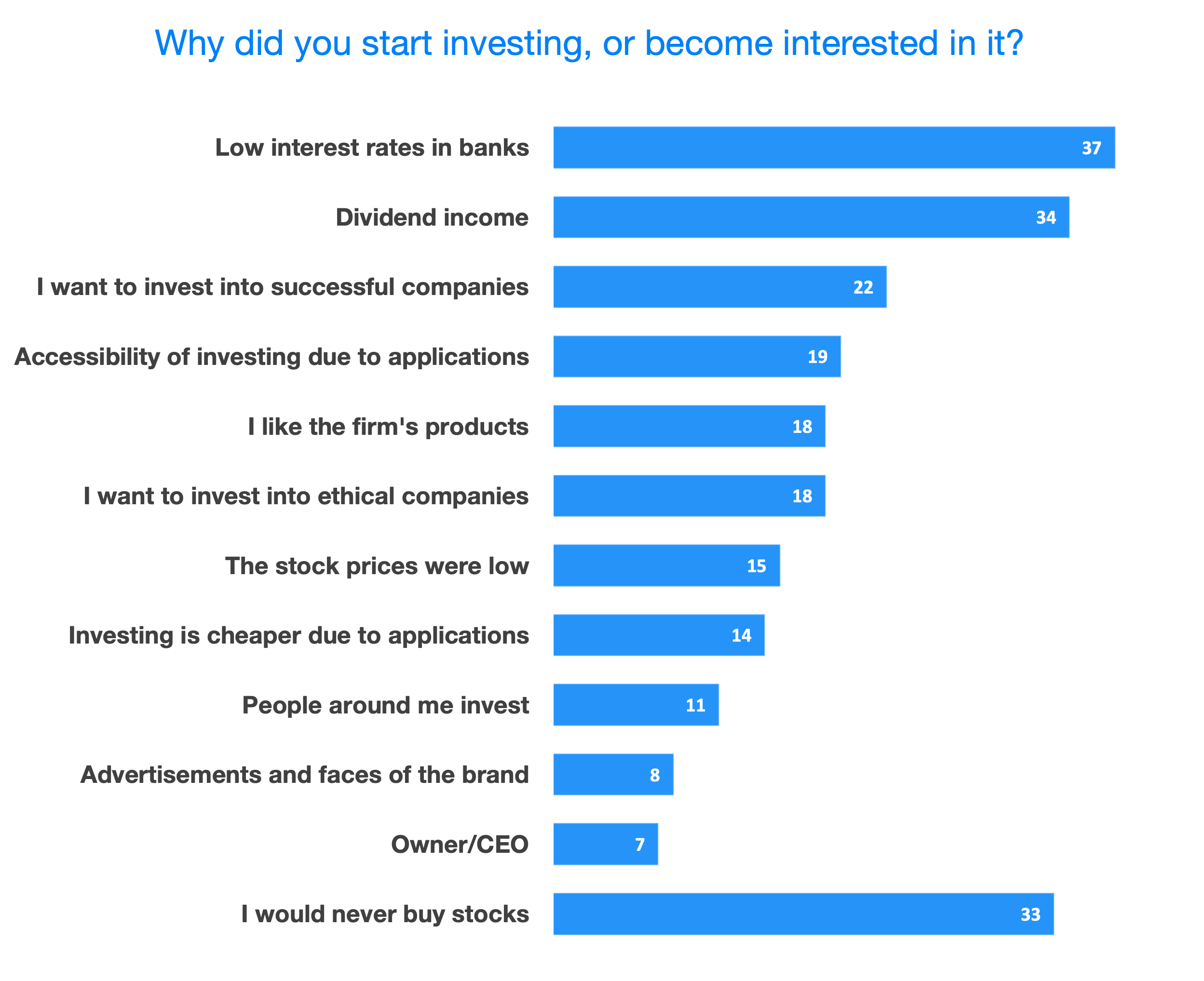 The main reasons for the appeal included low interest rates in banks, but also the availability of applications for trading, according to the survey. In the chart above you can see summarized reasons for the interest in investing for all generations. However, if we look solely at the Millennials, trading applications were an important reason for 44% of them.