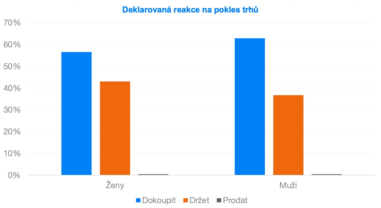 Naše klientky častěji prohlašují, že v případě poklesu na akciovém trhu by si raději ponechaly svá současná portfolia (42,99 % žen oproti 36,68 % mužů), přičemž méně často předpokládají, že by v takové situaci nakoupily více cenné papíry (56,54 % žen oproti 62,85 % mužů). Těžko však říct, do jaké míry by se tato prohlášení ve skutečnosti vyplnila. Nejnovější studie MIT naznačuje, že statisticky nejnáchylnější k panice na akciovém trhu jsou ... muži starší 45 let.