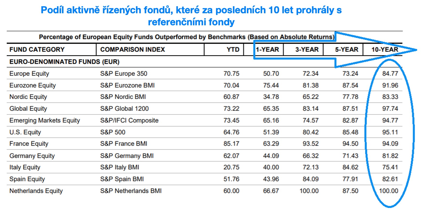 Hned vám to vysvětlím: pokud někdo investuje do globálních akciových fondů v měně EUR, porovnává se výkonnost fondů s indexem S&P Global 1200. V posledním roce 65,3 % aktivních fondů za tímto benchmarkem zaostává. V horizontu 3 let je to už 83,1 %, v horizontu 5 let 87,5 % a v horizontu 10 let 97,7 %. Jinými slovy, zhruba jeden aktivní fond z padesáti dokázal za posledních deset let porazit pasivní (indexové) investování.